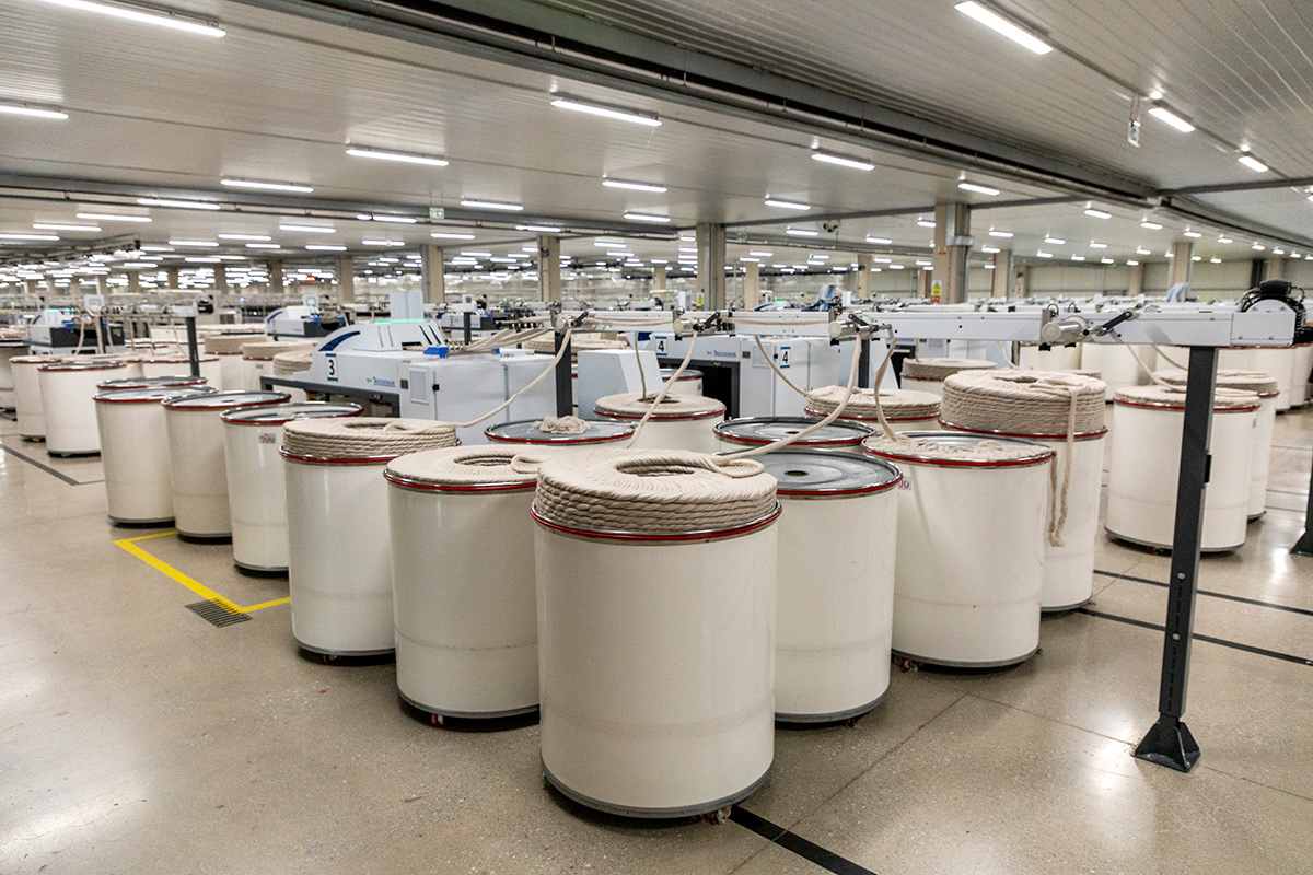 The Aksafil Technical Yarn Plant features a clear height of 7.50 m under the truss, with a single-story precast structure comprising five bays at 7.50 m × 22.50 m column spacing, housing production and storage areas.